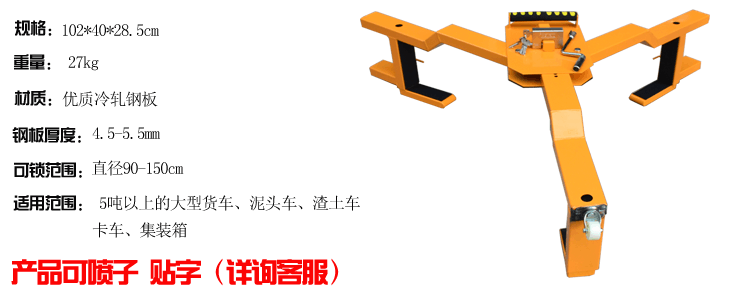 三爪重型車輪鎖鎖車器,強泰最新專利產(chǎn)品。主要依據(jù)重型拖掛車、泥頭車、大型貨柜車、大客車、楂土車等大馬力車輛專門打造的專用車輪鎖。安全性能高、整體性能牢固、承載力度大、鎖緊力強,鎖體非常堅固,可經(jīng)受任何工具的砸撬而不會對鎖體造成損壞。本鎖使用粗壯三條矩形無縫鋼管制造,釘罩盤使用雙層5MM優(yōu)質(zhì)鋼板沖壓制成,鎖體重達(dá)27KG,堅固耐用。